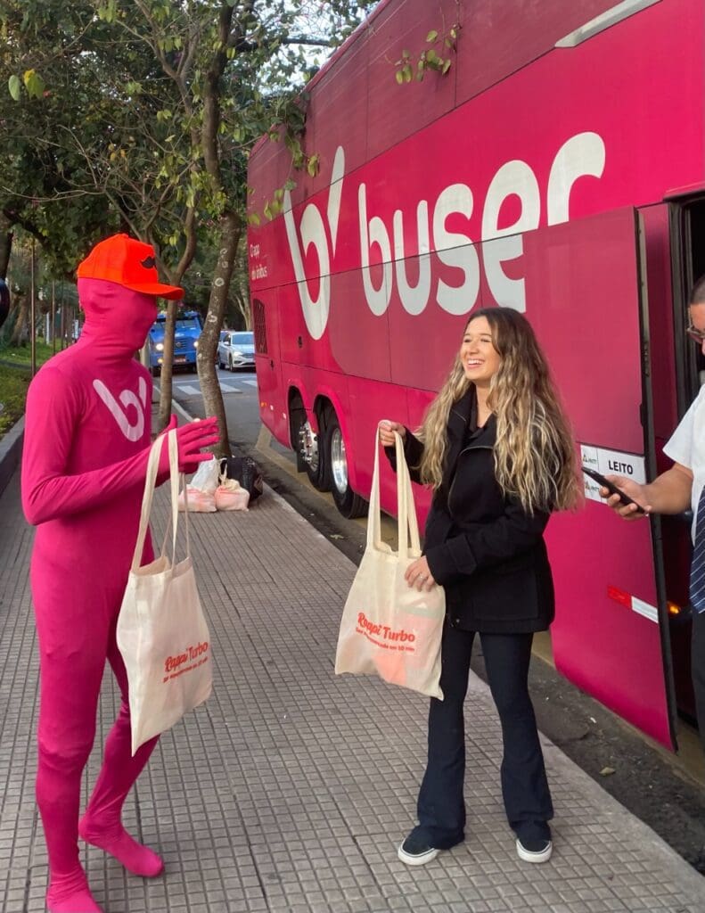 Para promover a parceria, as marcas têm apostado em uma campanha nas redes sociais, trazendo conteúdos no Instagram, TikTok e Twitter. O material é apresentado por um “Dummy” customizado da Buser. Trata-se de um ator vestido inteiramente do rosa característico da marca, e que tem participado das últimas campanhas, como a dos cinco anos da Buser e do Dia dos Namorados.