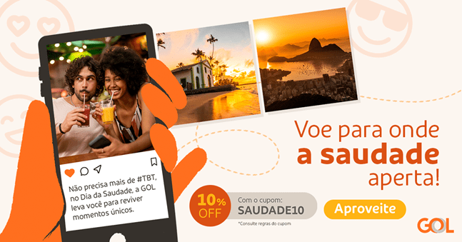 Dia da Saudade é comemorado anualmente em 30 de janeiro, e a Gol celebra a data pensando nos seus Clientes: por que não dar uma forcinha para diminuir as distâncias, gastando menos? Para ser utilizado das 8h nesta segunda-feira (30) até às 23h59 desta terça-feira (31), a Gol disponibiliza o promocode SAUDADE10, que concede 10% de desconto em passagens aéreas domésticas e internacionais para voar até junho deste ano.