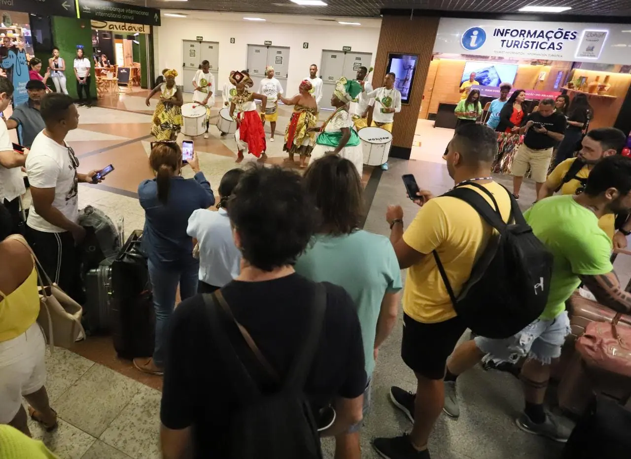 Ao som da batida dos tambores do bloco afro Muzenza e com o axé de baianas típicas, os passageiros que desembarcam no aeroporto de Salvador recebem as boas-vindas do receptivo especial de Momo, em frente ao posto do Serviço de Atendimento ao Turista (SAT), que funciona 24 horas para prestar orientações aos foliões. O trabalho integra as ações do Governo do Estado durante a festa, por meio da Secretaria de Turismo (Setur-BA).