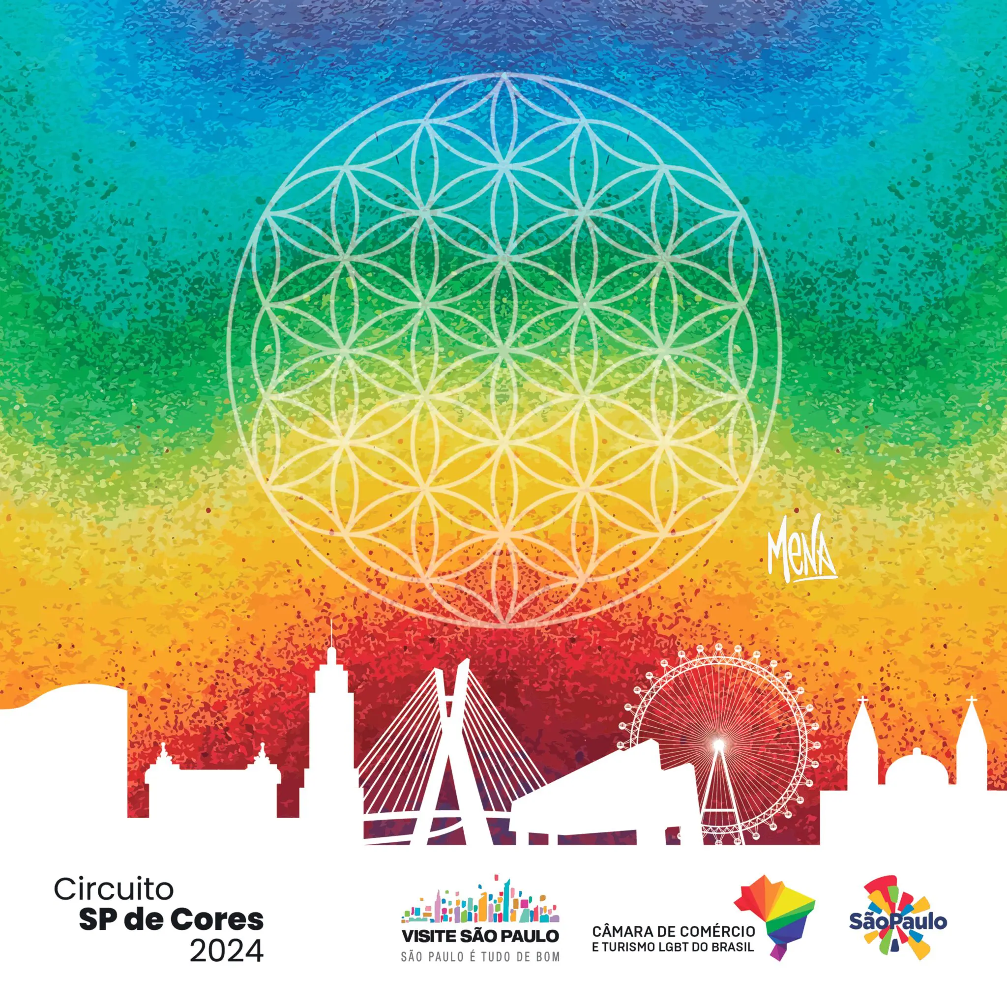 Mena explicou a inspiração por trás de sua arte. “Minha missão através da arte é semear mensagem de união e da liberdade de sermos quem somos. Quando recebi o convite para criar a arte do azulejo 2024, logo abracei com muito carinho. O arco-íris anuncia a chegada do Sol, da boa nova. É um símbolo de renovação e inclusão de todos os seres. Me sinto honrado em expressar as 7 cores, que são a fragmentação da Luz, e na Luz não há diferença, apenas amor. O Circuito SP de Cores celebra a diversidade e a união através da arte e da cor, representando não apenas a beleza vibrante de São Paulo, mas também o espírito inclusivo da comunidade LGBTI+. Nessa jornada colorida de amor e aceitação, apresentamos a Flor da Vida, um símbolo sagrado de antigas tradições, que emerge como um portal para compreender a interconexão universal e a harmonia da existência. Sua simetria e complexidade inspiram contemplação e reflexão, ecoando a importância de despertarmos para a unidade”, declarou Mena.