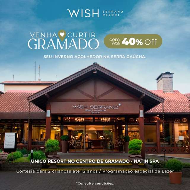 Os hotéis Wish Serrano Resort e Prodigy Gramado estão prontos para receber os hóspedes com muito conforto e excelentes condições. Com a campanha “Venha curtir Gramado com até 40% off”, o Grupo Wish oferece diárias promocionais inéditas para este período do ano. Além disso, famílias se beneficiarão com a cortesia para até duas crianças de até 12 anos hospedadas no mesmo quarto dos pais.