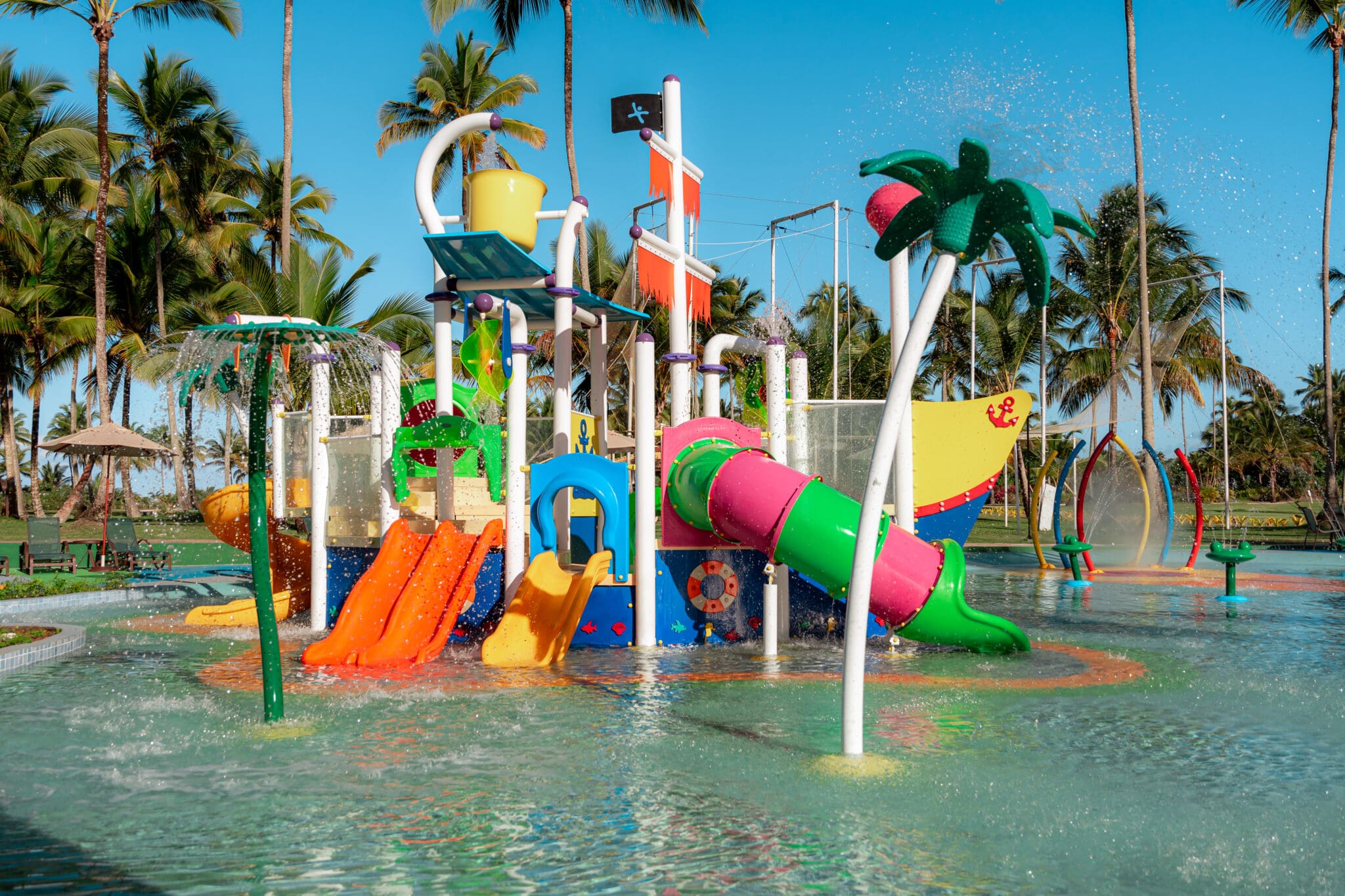 A piscina está dividida em três áreas para diferentes faixas etárias. Para os bebês, há um espaço com profundidade de 10 a 20 cm, ideal para os pequeninos se refrescarem. Para as crianças de 3 a 5 anos, a área com o brinquedo em formato de barco garante diversão segura e supervisionada. E para as de 7 a 12 anos, a área de escorregadores oferece aventura e emoção, com outros brinquedos interligados ao que já existe no resort.